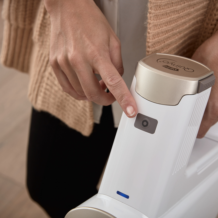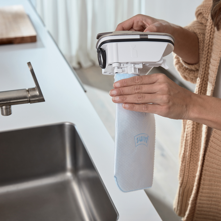 Is je woning weer schoon, dan berg je de Swirl® Quinyo® gemakkelijk en compact op in het laadstation aan de muur. Netjes aan de kant, en snel weer helemaal opgeladen voor de volgende sessie.